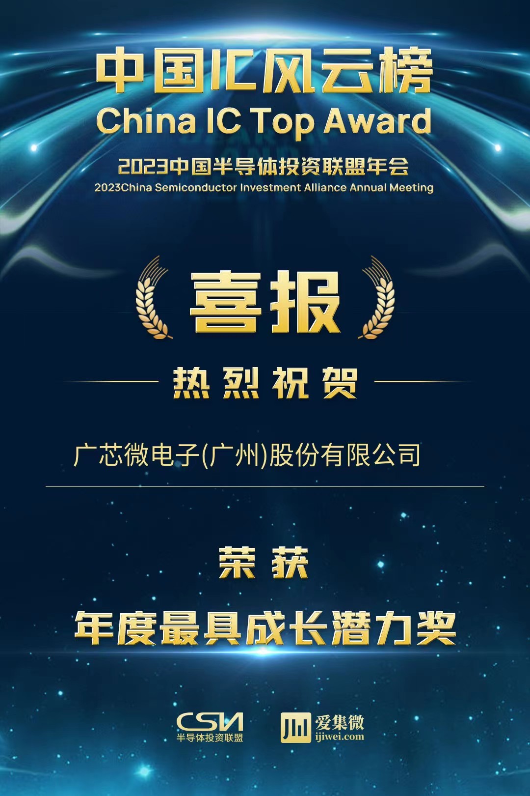 12月17日,2023中國半導體投資聯(lián)盟年會暨中國IC風云榜頒獎典禮在合肥舉辦,廣芯微電子(廣州)股份有限公司獲中國IC風云榜“年度最具成長潛力獎”。